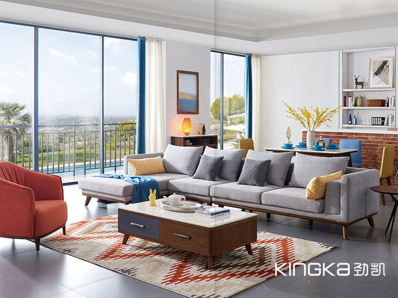 劲凯家居现代北欧客厅北美白蜡木实木活力布艺转角沙发+茶几组合