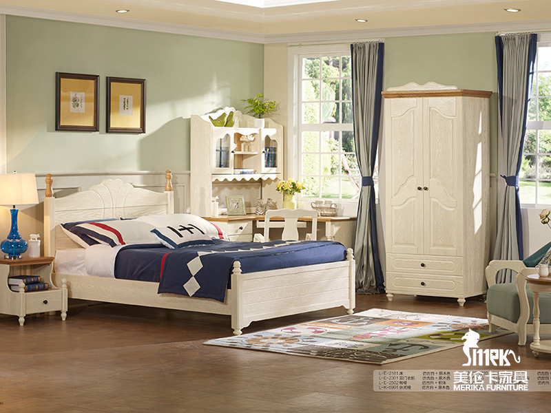 健辉家居·美伦卡家具香缇丽舍卧室白蜡木仿古白加原木色床+转角书桌+衣柜MLK011