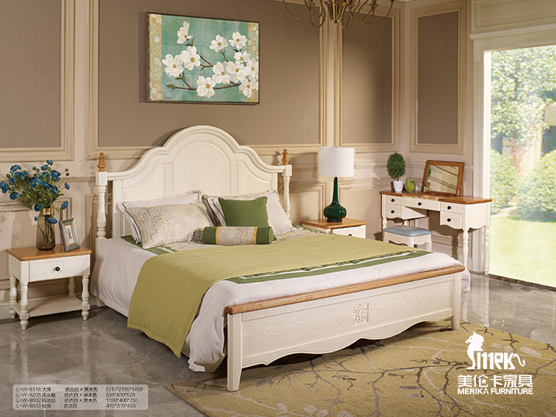 健辉家居·美伦卡家具香缇丽舍美式卧室白蜡木仿古白加原木色双人大床加床头柜和简单梳妆台MLK006