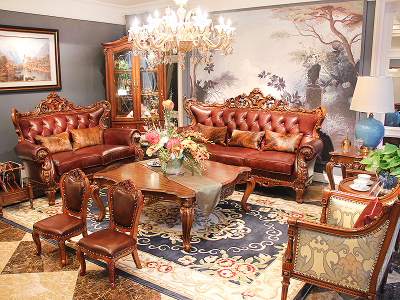 大森家私家具欧美客厅德国红榉木实木头层牛皮双人位/三人位/单人位沙发组合/大茶几/别墅家具/酒柜