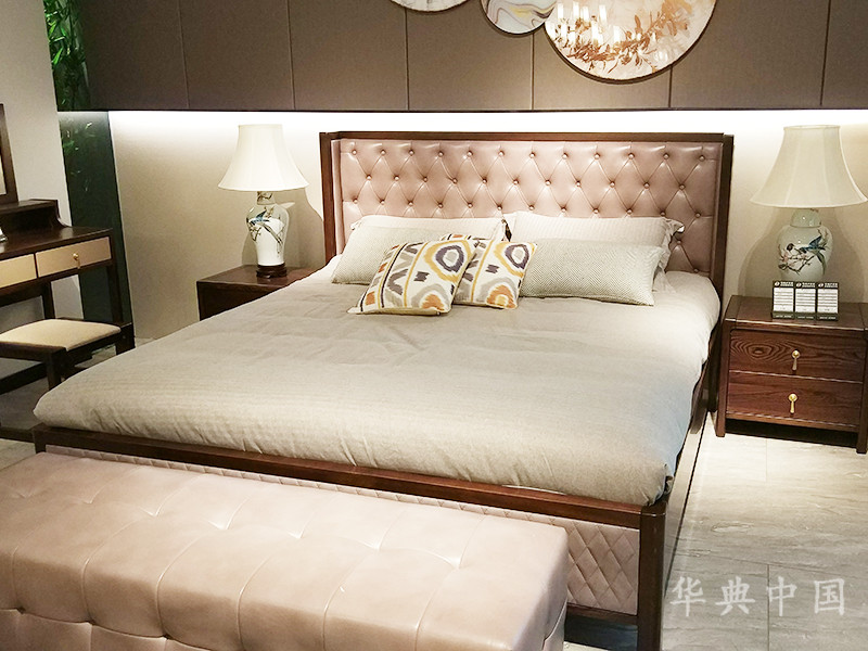 华典中国·欧尚格家居新中式卧室榆木实木双人软靠大床+床头柜+床尾凳组合