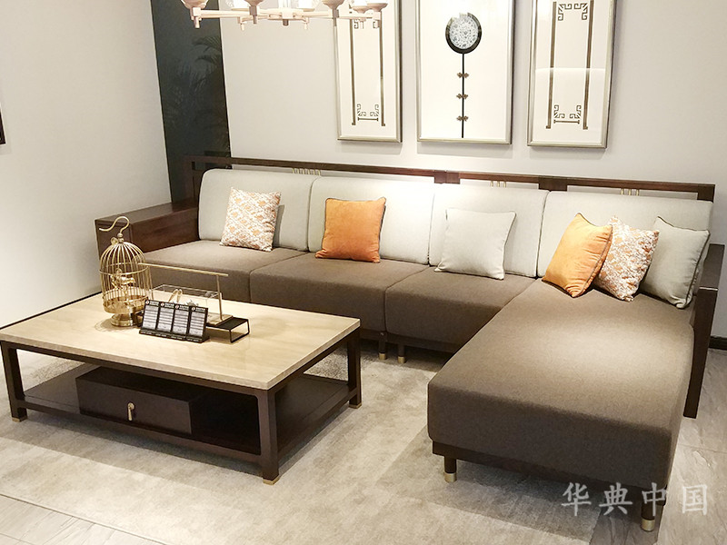 华典中国·欧尚格家居新中式客厅榆木实木淡雅带贵妃榻沙发+茶几组合