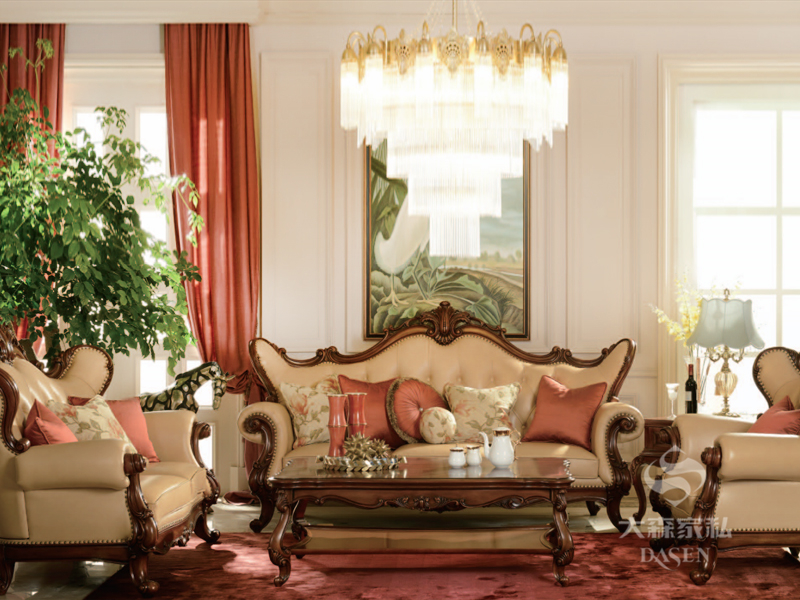 大森家具华东营销中心欧式客厅红榉木实木浅色沙发+茶几组合