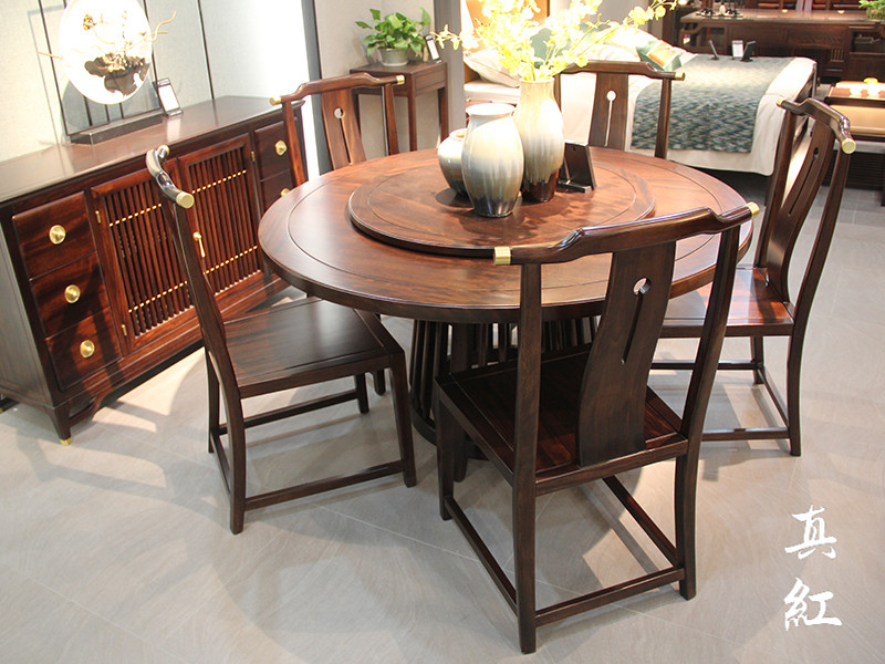 真红家具新中式餐厅乌金木实木圆形带转盘餐桌椅组合