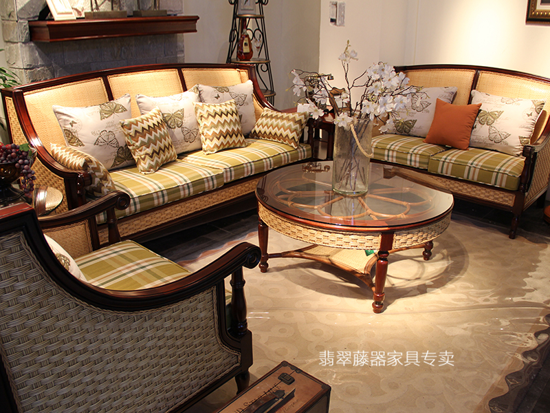 翡翠藤器家具 美式客厅实木印尼藤双人位+三人位+单人位沙发组合/茶几