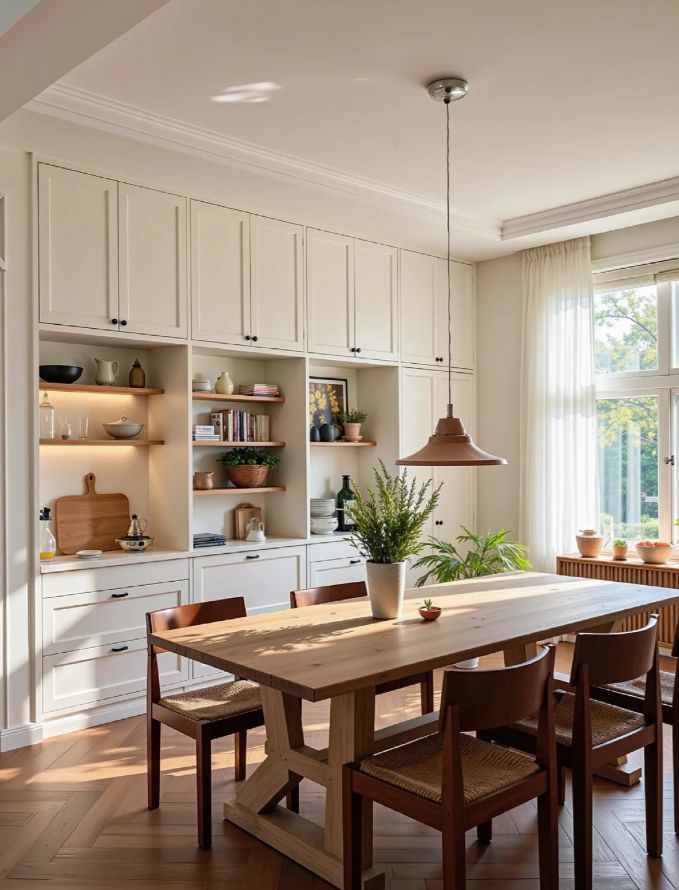 餐厅的主角: 是餐桌椅。一张厚重的实木长桌和一套轻盈的岩板圆桌,营造的氛围截然不同。